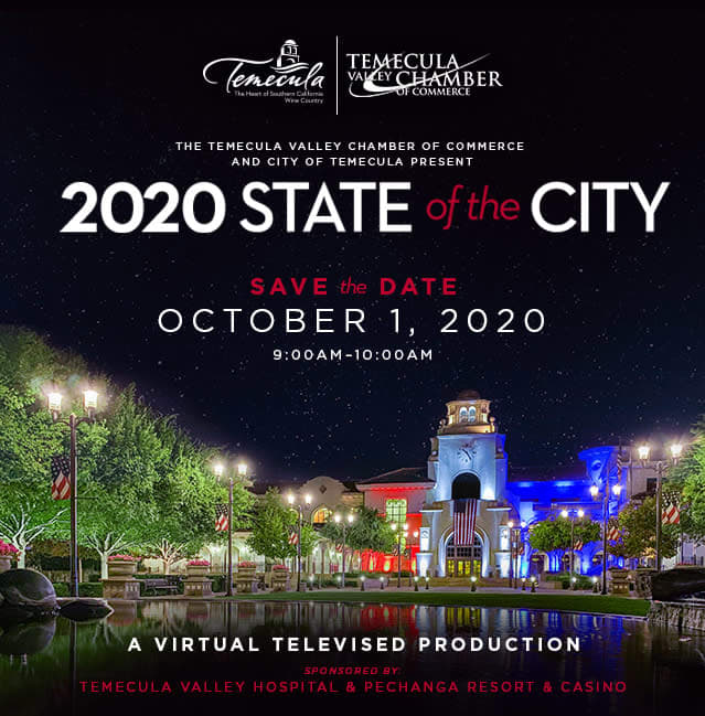We are proud to announce the Temecula State of the City Address will take place Thursday, October 1, 2020 at 9:00am as a virtual televised production. This presentation will include important City updates and developments from all four of the City Council members. Stay tuned for the link to join. There is no charge to attend.