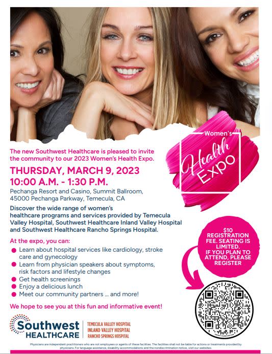 Southwest Healthcare which includes Temecula Valley Hospital, Rancho Springs Hospital, and Inland Valley Hospital, is hosting the Women’s Health Expo on Thursday, March 9th, from 10:00 am to 1:30 pm at the beautiful Pechanga Resort and Casino Summit Ballroom.