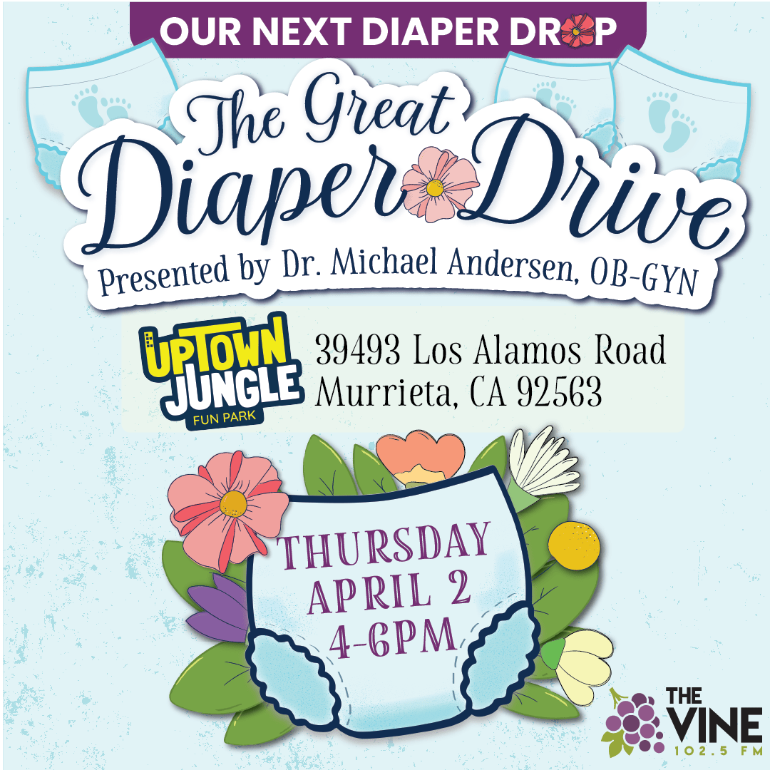 Get ready to give back and make a difference in Southwest Riverside County! 102.5 FM, the local Christian radio station, is hosting The Vine FM’s Great Diaper Drive, presented by Dr. Michael Andersen, OB-GYN is here, and we need your help to support local moms and families in need. Diapers are the number one essential for families with babies, yet they are also one of the biggest expenses, leaving many parents struggling to keep up. That’s where YOU come in! Together, we can meet a critical need and ensure that every baby in our community has a clean, dry diaper. Stop number five is at Uptown Jungle at 39493 Los Alamos Rd, Murrieta, CA 92563, Thursday, April 2nd, from 4 to 6 pm. Bring new, fully packaged diapers and help a local mom breathe again when she opens the closet and sees she has what her baby needs. Let’s meet a real need, one diaper at a time. And don’t forget to follow The Vine FM on social and keep up with our drive to 10,000 diapers.