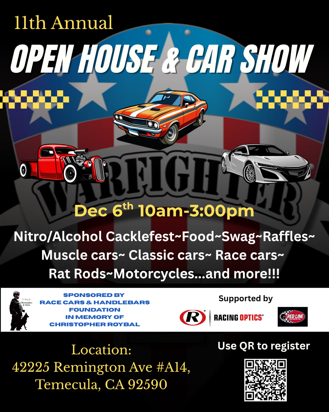 Come enjoy a fun filled day of muscle cars, classic cars, hot rods, and more! Over 50 cars will be on display, as well as a bounce house for the kids, raffles, free swag, and so much more! This is a free event, open to the public. Join us by registering on our website. If you have a car you'd like to enter, you can do that on our site, too! What a great way to come together and celebrate another amazing year!Images