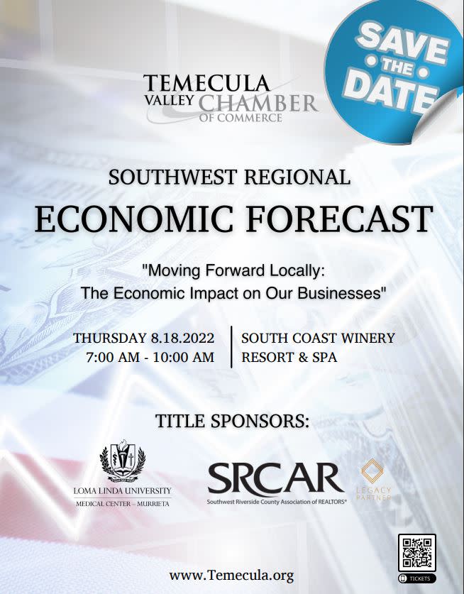 Join us for this informative presentation providing insights into the current state of our region's economy and its impact on people living here in Southern Riverside County. Topics to be discussed are real estate, retail, inflation, recession, and more. This event will not only provide crucial information about where we are headed but also help you plan strategically for the rest of 2022 and beyond! This event is open to the public and will be held from 7:00 AM – 10:00 AM on August 18, 2022, at South Coast Winery Resort & Spa.
