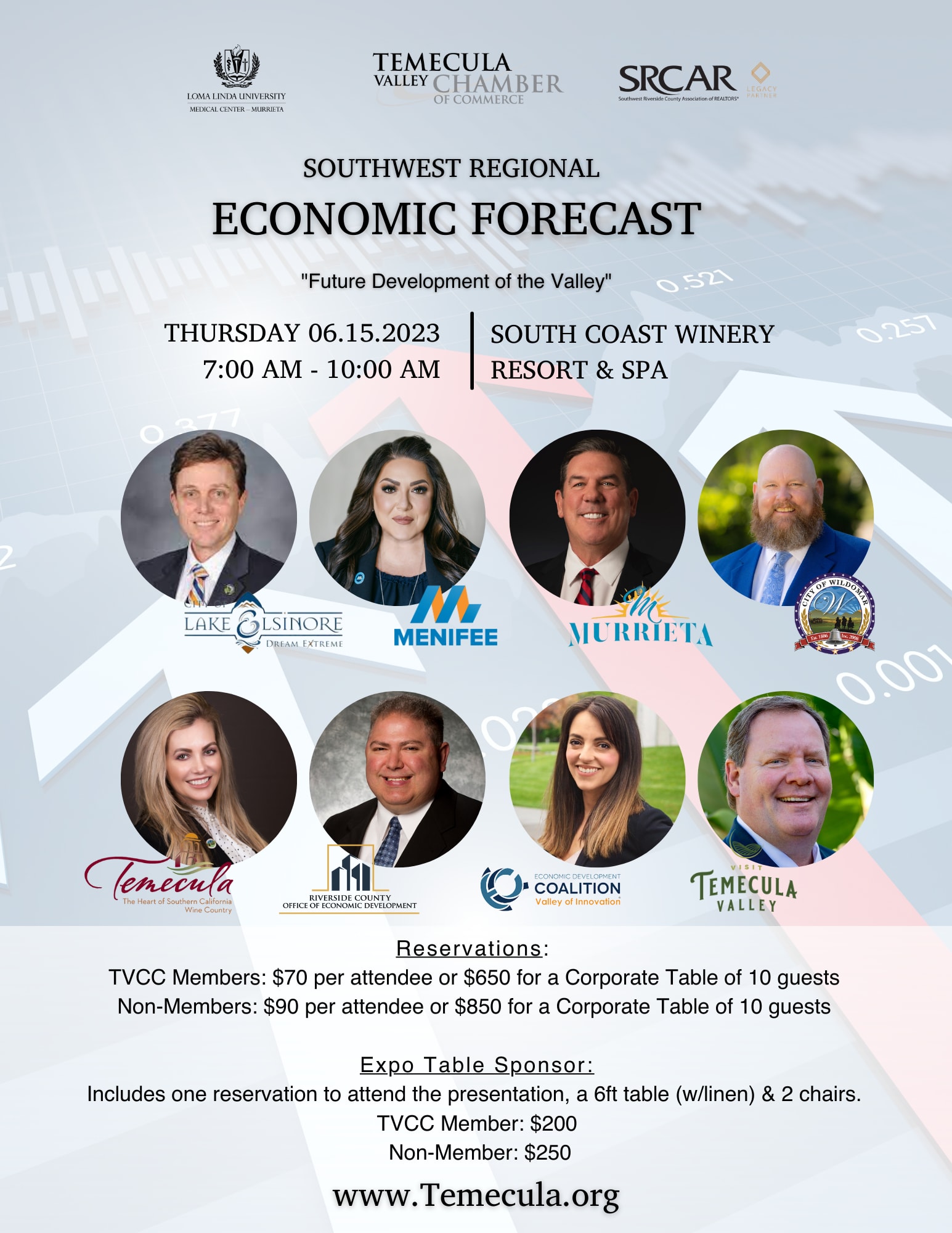 Join the Temecula Valley Chamber of Commerce and top economic development experts for an exclusive look at the current and upcoming economic landscape of the region. Discover the state of Southwest Riverside County's economy and its potential impact on your financial future. This educational event offers invaluable strategic planning insights for 2023 and beyond. Don't miss this opportunity to gain crucial knowledge on June 15, 2023, from 7:00 AM to 10:00 AM at South Coast Winery Resort & Spa. This Southwest Regional Economic Forecast is open to all members of the public and provides essential information on the current state of the economy and its influence on businesses and citizens. Sponsored by Loma Linda University Medical Center Murrieta and Southwest Riverside County Association of Realtors (SRCAR).