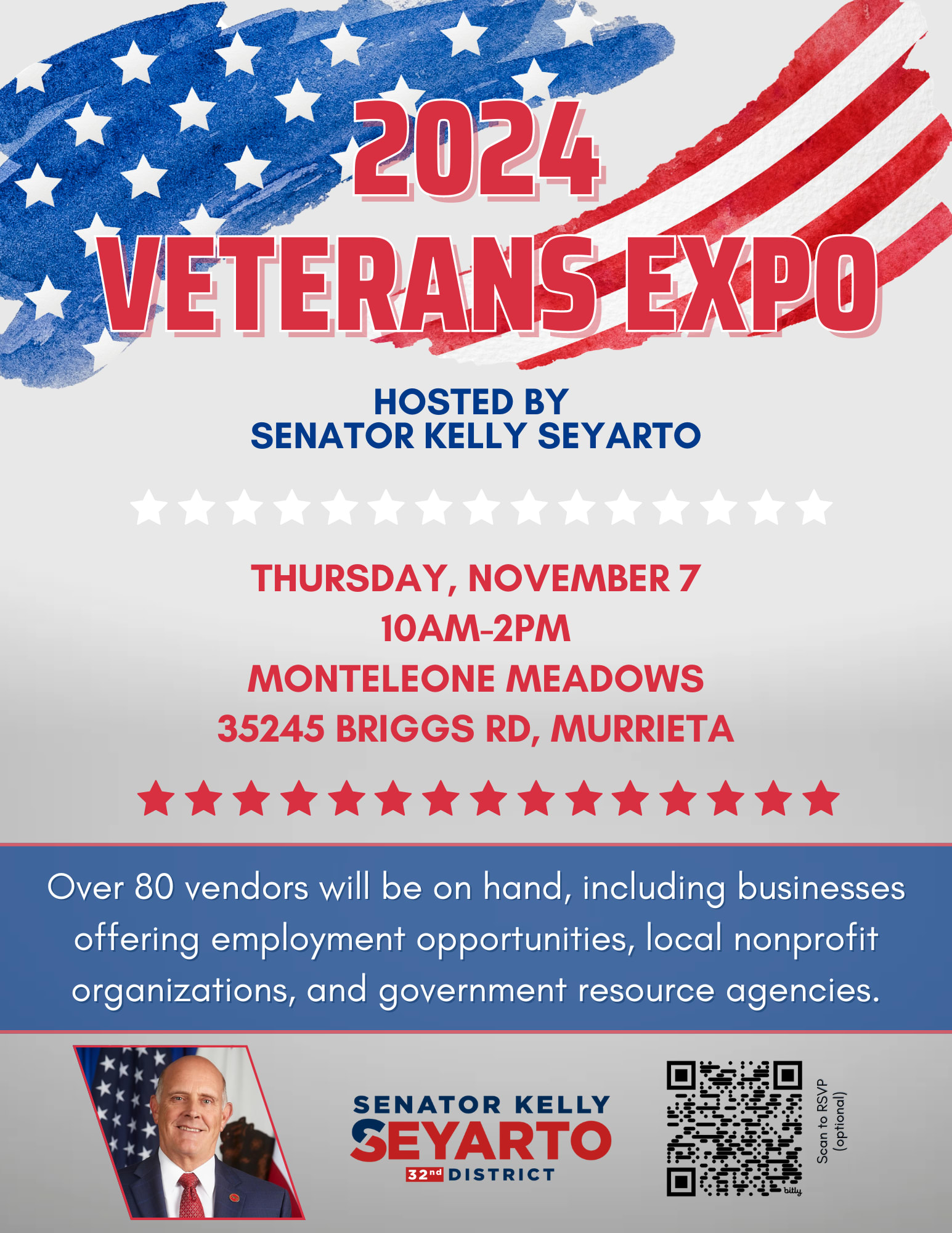 Please join us at our annual Veterans Expo put on by Senator Kelly Seyarto, 32nd Senate District. 65+ Resources for you and your family!