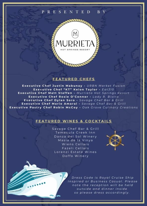 Join us for an unforgettable evening at the Murrieta Hot Springs Resort, where we will set sail for a night of elegance and excitement. This cruise-themed celebration features a multi-course seated dinner, craft cocktails, and fine local wines. Enjoy Silent and Live Auction opportunities and a special performance by the talented Oak Grove Youth.