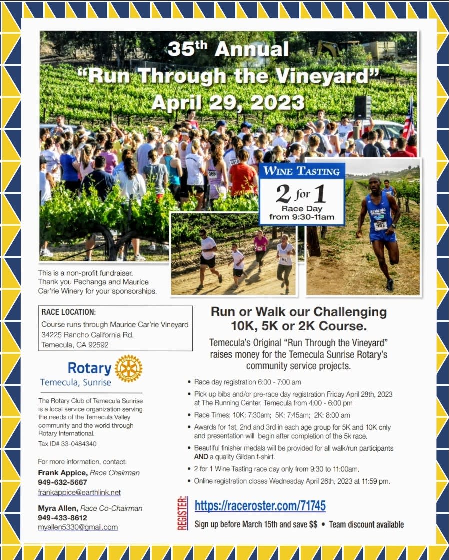 Myra Allen Past President and Race Co-Chair extends a Cordial invitation... Join us for our 35th Annual "Run Through the Vineyard " Saturday, April 29th, 2023. You too Can be a Winner by your generosity in sponsorship. Build a team or bring back your team to run with us for this Amazing 35th Annual Race🏃🏃♀️🏃🏃♀️🏃🏃♀️🏃🏃♀️! Visit our race website, https://raceroster.com/71745 Register before March 15th and save $$. Team discount available.