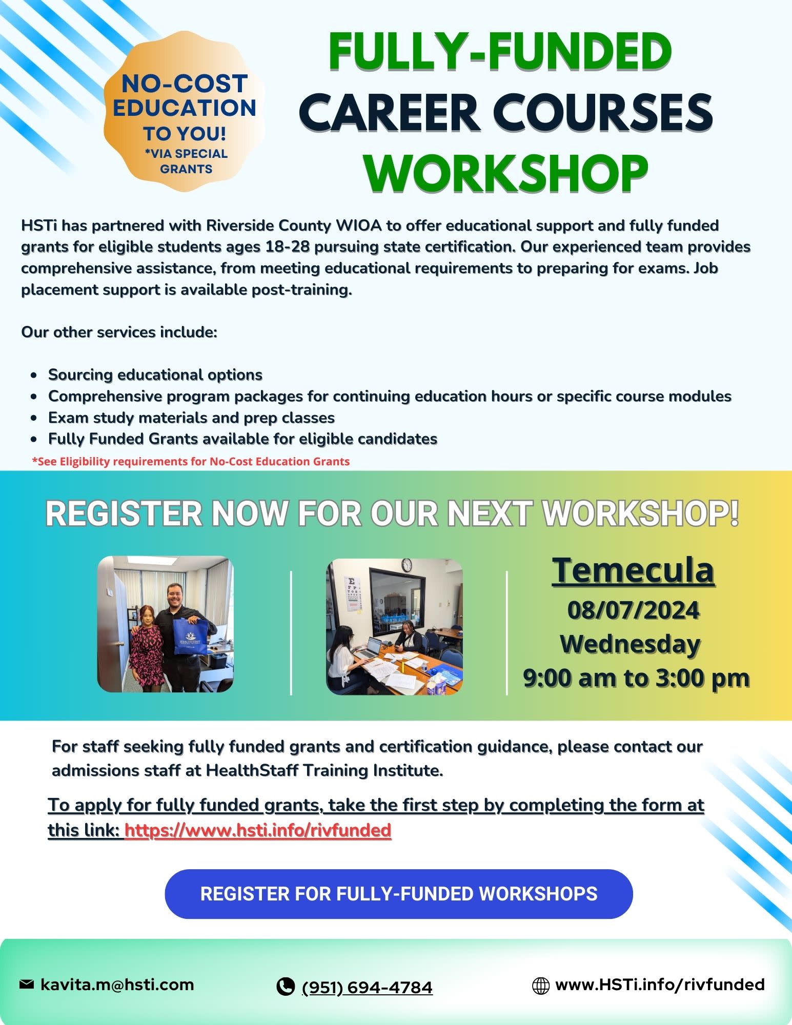 HealthStaff Training Institute has partnered with Riverside County WIOA to offer educational support and fully funded grants for eligible students ages 18-28 pursuing state certification. Our experienced team provides comprehensive assistance, from meeting educational requirements to preparing for exams. Job placement support is available post-training. Workshop is on Wednesday 8/07 from 9am-3pm.