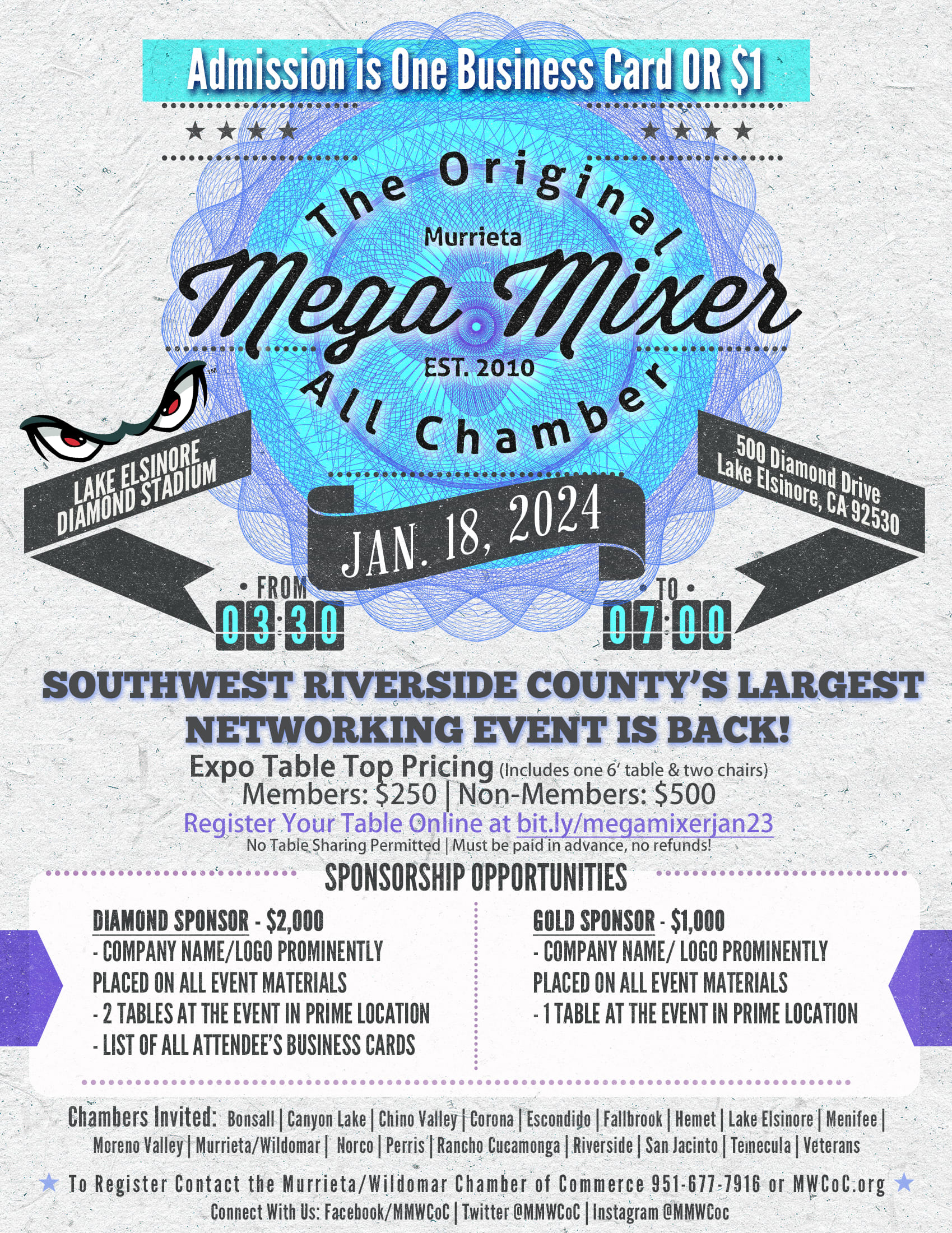 In the world of business, networking has never been more important than it is today. The All-Chamber MEGA Mixer is a unique opportunity to connect with like-minded individuals, all while expanding your reach within the business community. This event is powered by our local chambers, all working together toward the common goal of connecting businesses throughout the region. With just your business card, you can gain admission to this networking extravaganza, which promises to be both informative and engaging. For those seeking more exposure, there are expo tables available, allowing you to showcase your goods or services to a wider audience. Be sure to select our chamber for the ultimate networking experience and let us be champions for your business! Expo booths are just $250 for chamber members or $500 for non-members. Make sure to reserve your expo table as a "Temecula Chamber Member".