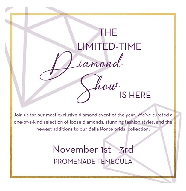 Join us for our most exclusive diamond event of the year. We've curated a one-of-a-kind selection of loose diamonds, stunning fashion styles, and the newest additions to our Bella Ponte bridal collection. Don't miss your chance to get a first-hand look and enjoy special financing on certain purchases* only available during this incredible event and the month of November. To make an appointment, please call 951-587-4242.