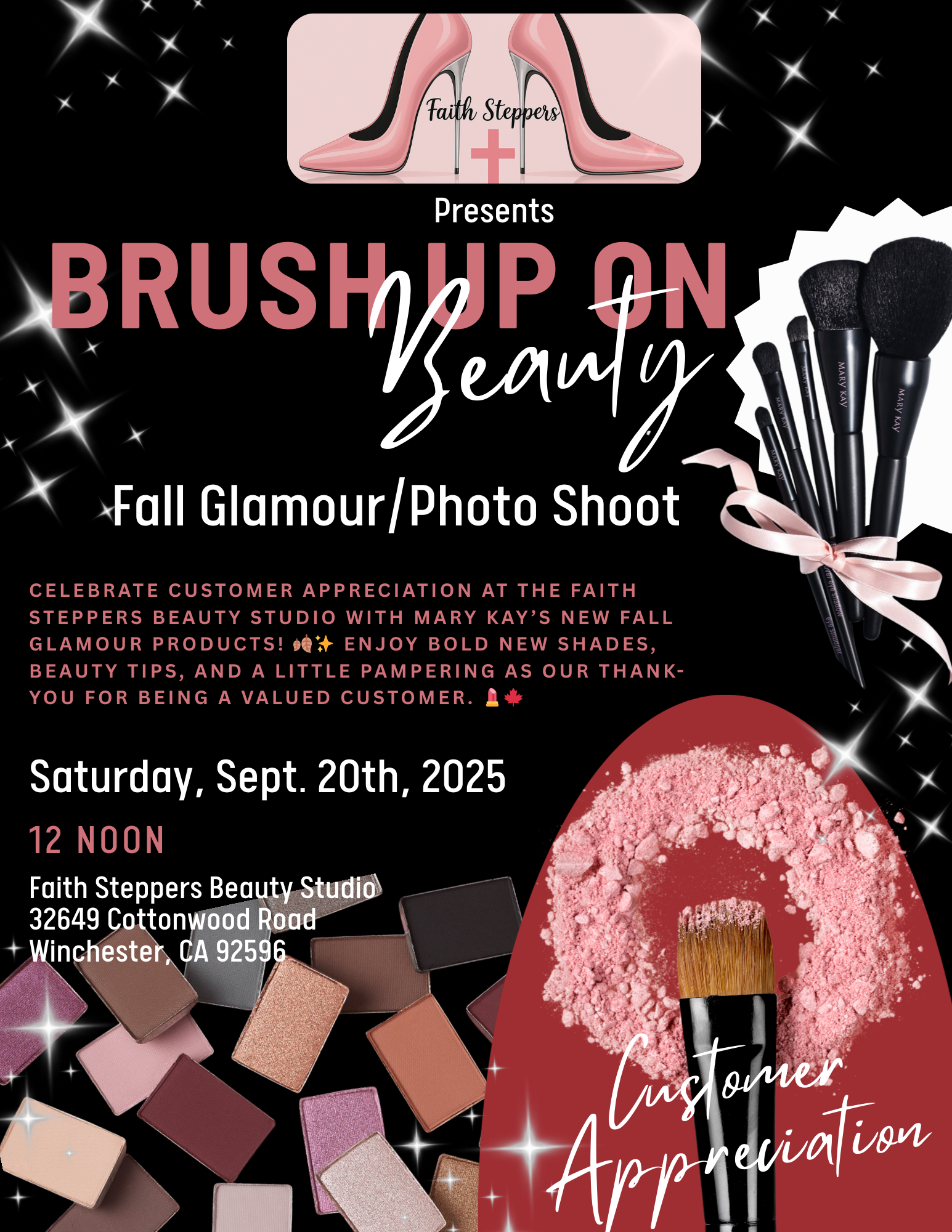 Celebrate customer appreciation at the Faith Steppers Beauty Studio with Mary Kay’s New Fall Glamour products! Enjoy bold new shades, beauty tips, and a little pampering as our thank-you for bring a valued customer.