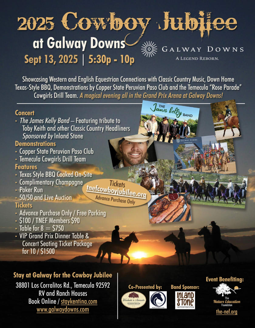 Celebrate the Western and English equestrian cultures with a magical evening at Galway Downs to include Texas -style BBQ cooked on-site, performances by the Copper State Peruvian Paso Club and the Temecula Cowgirl Drill Team; a country concert with the high energy James Kelly Band featuring a tribute to Toby Keith and other classic country headliners. Extra fun includes a Poker Run, high stakes 50/50 and luxury live auctions. Benefit fundraiser in support of youth nature education programs provided by The Nature Education Foundation.