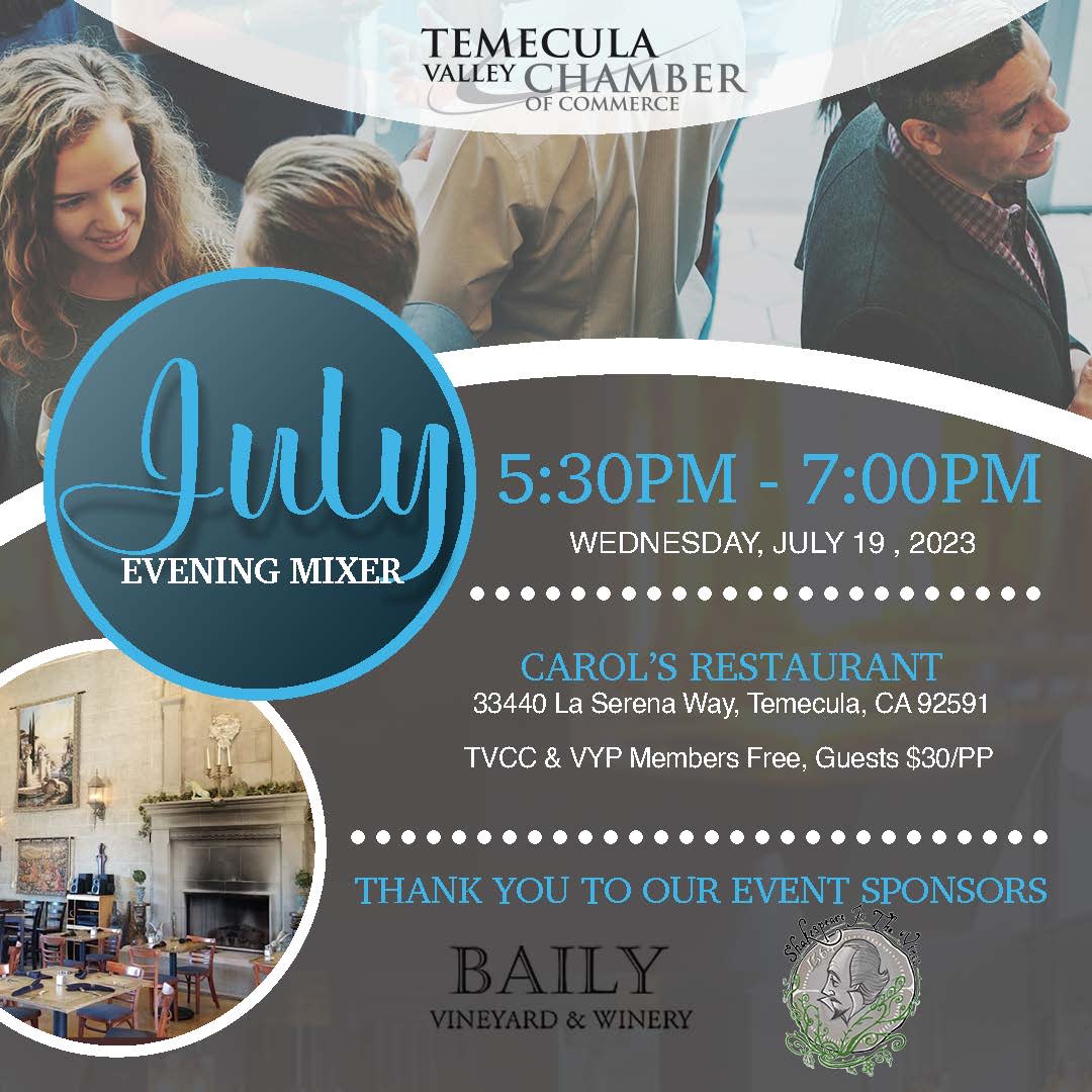 Hark! Thee art summoned to the July Evening Mixer, sponsored by Shakespeare in the Vines and Carol's Restaurant at Baily Winery! 'Tis an occasion to mingle, make merry and form connections within the business community! Verily, TVCC members art permitted free entry, while guests may partake for a mere $30. 'Tis imperative that thou register posthaste! Thou shall not go hungry or thirsty, for there shall be victuals and libations aplenty. Plus, entertainment and nifty prizes await thee! So what art thou waiting for? Come join in the revelry!