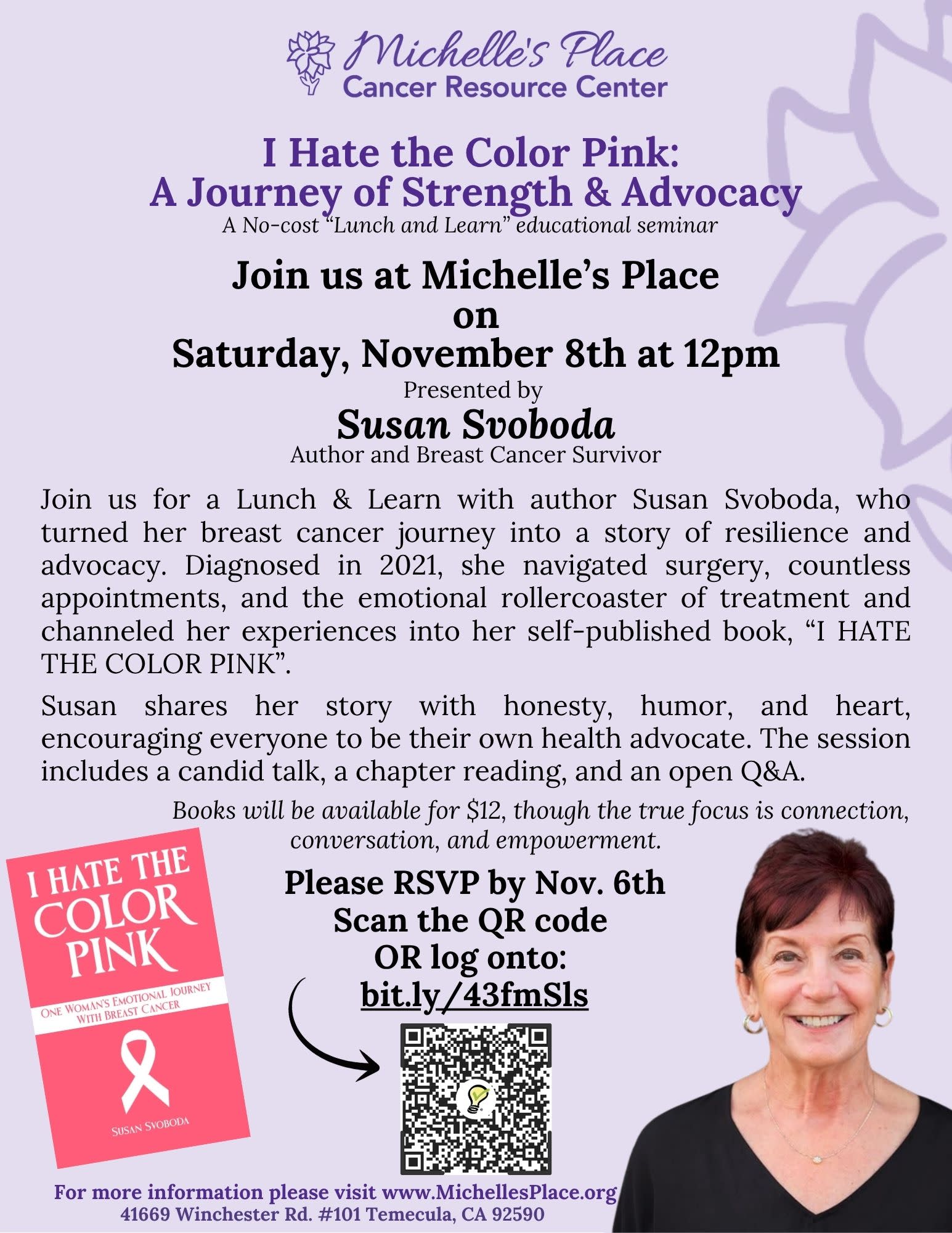 Lunch & Learn: “I HATE THE COLOR PINK” with Author Susan Svoboda Michelle’s Place Cancer Resource Center invites the community to a free educational Lunch & Learn on Friday, November 8th at 12:00 p.m. Join us for an inspiring afternoon with Susan Svoboda, author of I HATE THE COLOR PINK, as she shares her journey through breast cancer — from diagnosis in 2021 to surgery, recovery, and finding strength through self-advocacy. With honesty, humor, and heart, Susan encourages others to take charge of their health and find resilience in life’s toughest moments. The session includes a candid talk, a short chapter reading, and an open Q&A. RSVP by November 6th Scan the QR code or visit bit.ly/43fmSls Location: Michelle’s Place Cancer Resource Center Cost: No charge – lunch provided For more information, visit michellesplace.org or call 951-699-5455