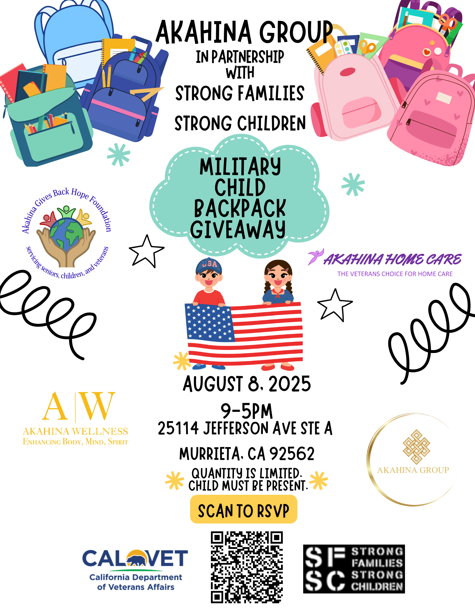 The Akahina Group, including Akahina Home Care, Akahina Wellness, and the Akahina Gives Back Hope Foundation, is honored to partner with Strong Families Strong Children to host our very first Military Child Backpack Giveaway in the city of Murrieta, CA. This meaningful collaboration continues our long-standing relationship with Strong Families Strong Children, based in Orange County, as we work together to support military children and their families through this beautiful cause.
