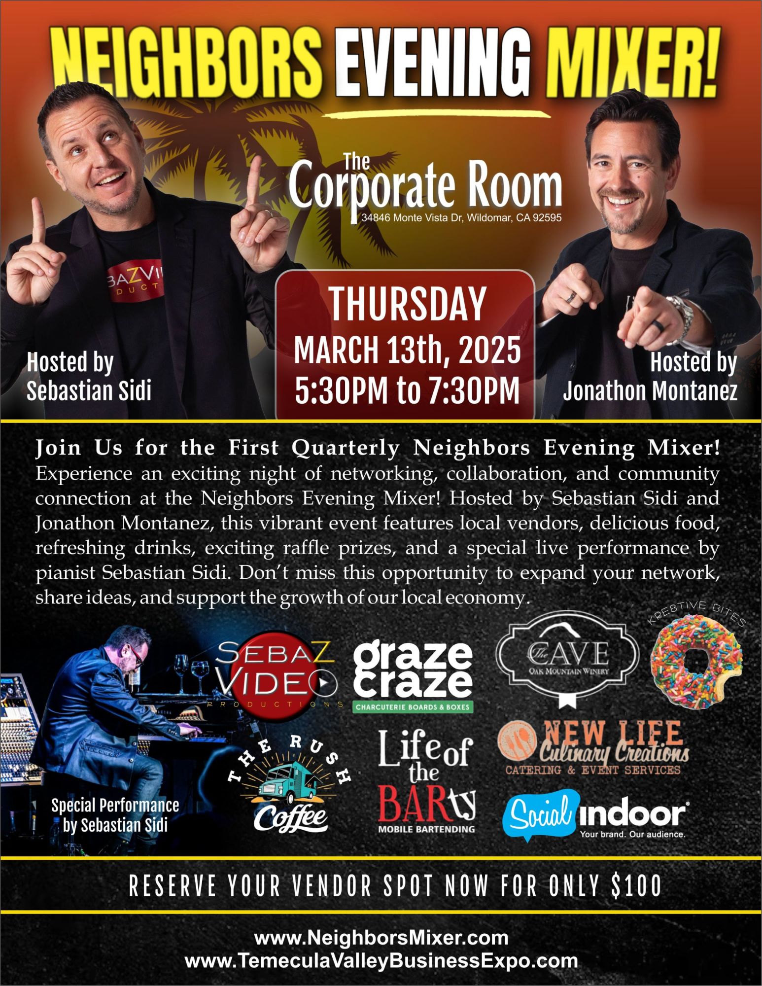 Sebastian Sidi and Jonathon Montanez invite you to the 1st Neighbors Evening Mixer. This evening edition is designed to bring together local entrepreneurs, professionals, and community leaders for a night of high-energy networking, collaboration, and opportunities. ✨ What to Expect: ✅ Meet and connect with like-minded business professionals ✅ Special guest speakers and local leaders ✅ Live entertainment ✅ Food, drinks, and a vibrant atmosphere Don’t miss this opportunity to expand your network and strengthen your connections in a dynamic and engaging setting! 📢 RSVP now and be part of this inaugural evening event! www.NeighborsMixer.com