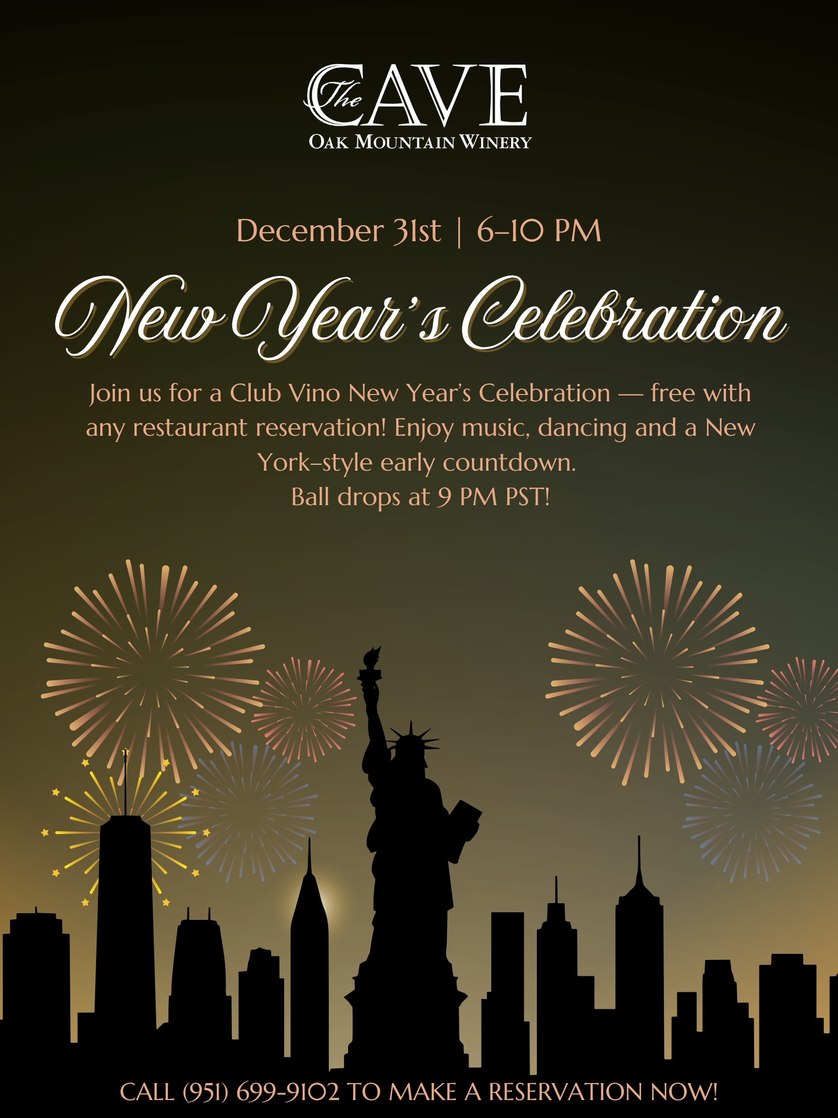 Ring in the New Year with our Club Vino New Year's Celebration from 6-10pm on Wednesday, 12/31! We are celebrating New York style with music, dancing, and an early countdown. Free Admission with any 12/31 reservation with The Cave Cafe. Ball drops at 9pm. VIP with Bottle Service available for $150.Images