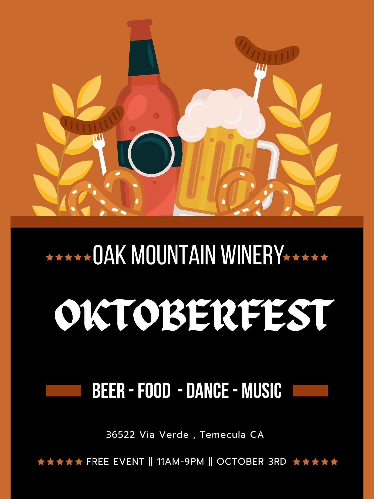Prost! Join us at Oak Mountain Winery for our lively Oktoberfest celebration! Enjoy a day filled with authentic food, ice-cold beer, live music, and dancing. 36522 Via Verde, Temecula, CA Friday, October 3rd 11am-9pm FREE EVENT - Bring your friends and family!