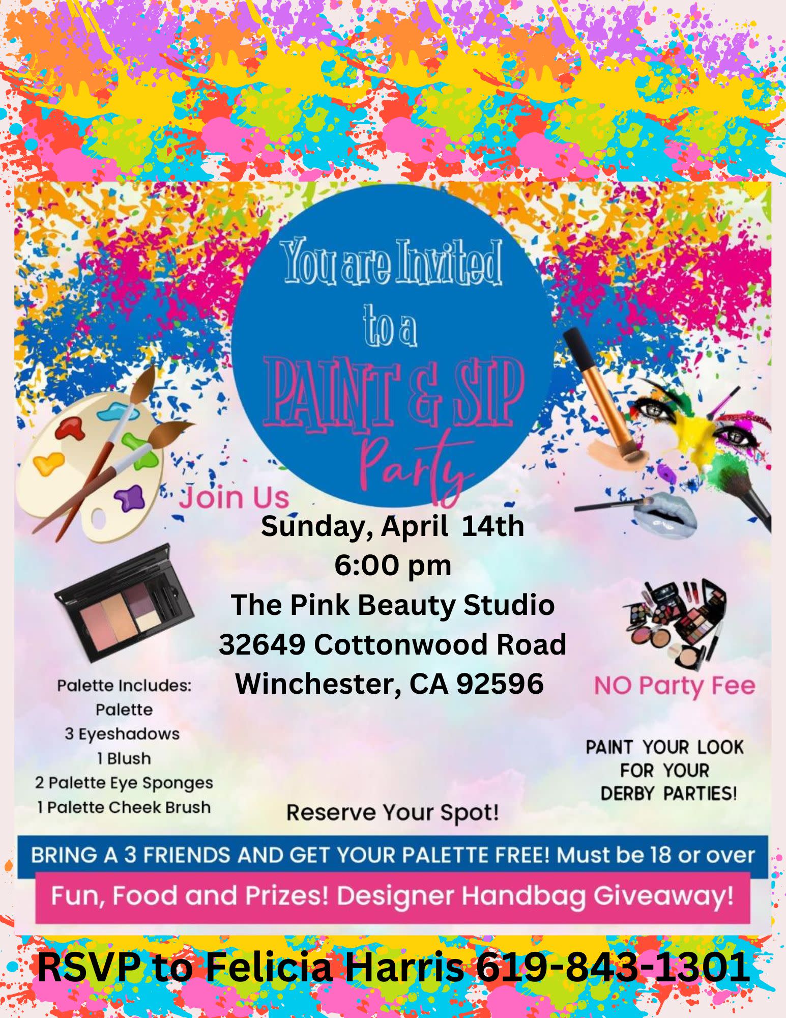 No Party Fee. Paint your Look at our Derby Party! Bring 3 friends and get your color palette FREE! food, fun and prizes! Designer Handbag Giveaway!