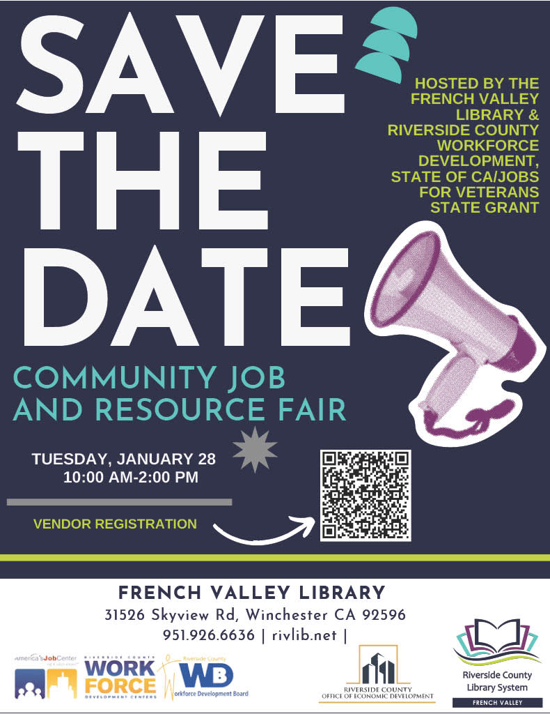 The Community Job and Resource Fair is hosted by the French Valley Library, Riverside County Workforce Development Center & Board, and Riverside County Office of Economic Development. No charge to attend.