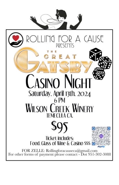 Here it is…another great event by “Rolling For a Cause” your Ruby nominee for non-profit of the year Temecula Valley Chamber of Comnerce!! See Invitation, take advantage of the early bird ticket price, something funs about to happen, come join the fun, food, bubbles and $200 casino money included. sponsorship & advertising available!!