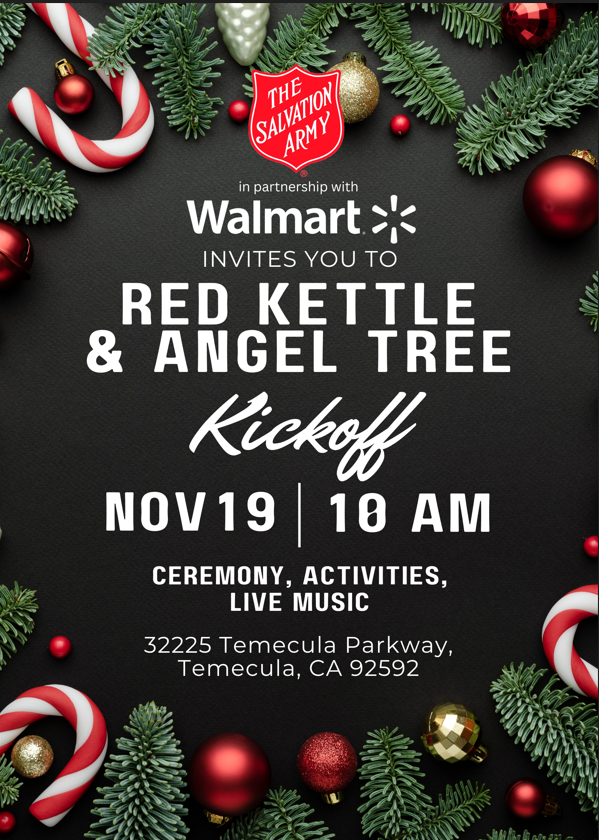 The Salvation Army, in partnership with Walmart, is delighted to invite you to the Red Kettle and Angel Tree Kickoff event! This special occasion marks the beginning of the season of giving, and we are thrilled to celebrate it with you.
