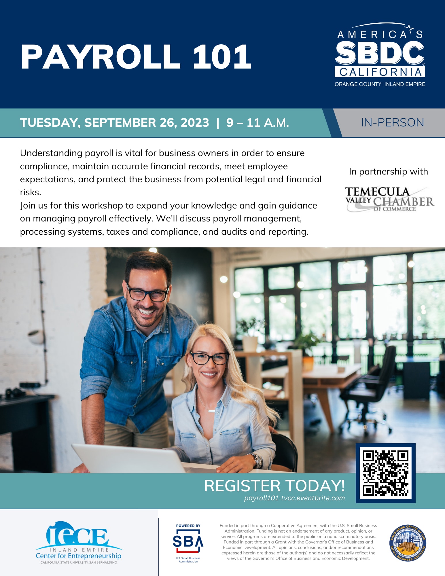 Understanding payroll is vital for business owners in order to ensure compliance, maintain accurate financial records, and meet employees. expectations, and protect the business from potential legal and financial risks. Join us for this workshop to expand your knowledge and gain guidance on managing payroll effectively. We'll discuss payroll management, processing systems, taxes and compliance, and audits and reporting.Images