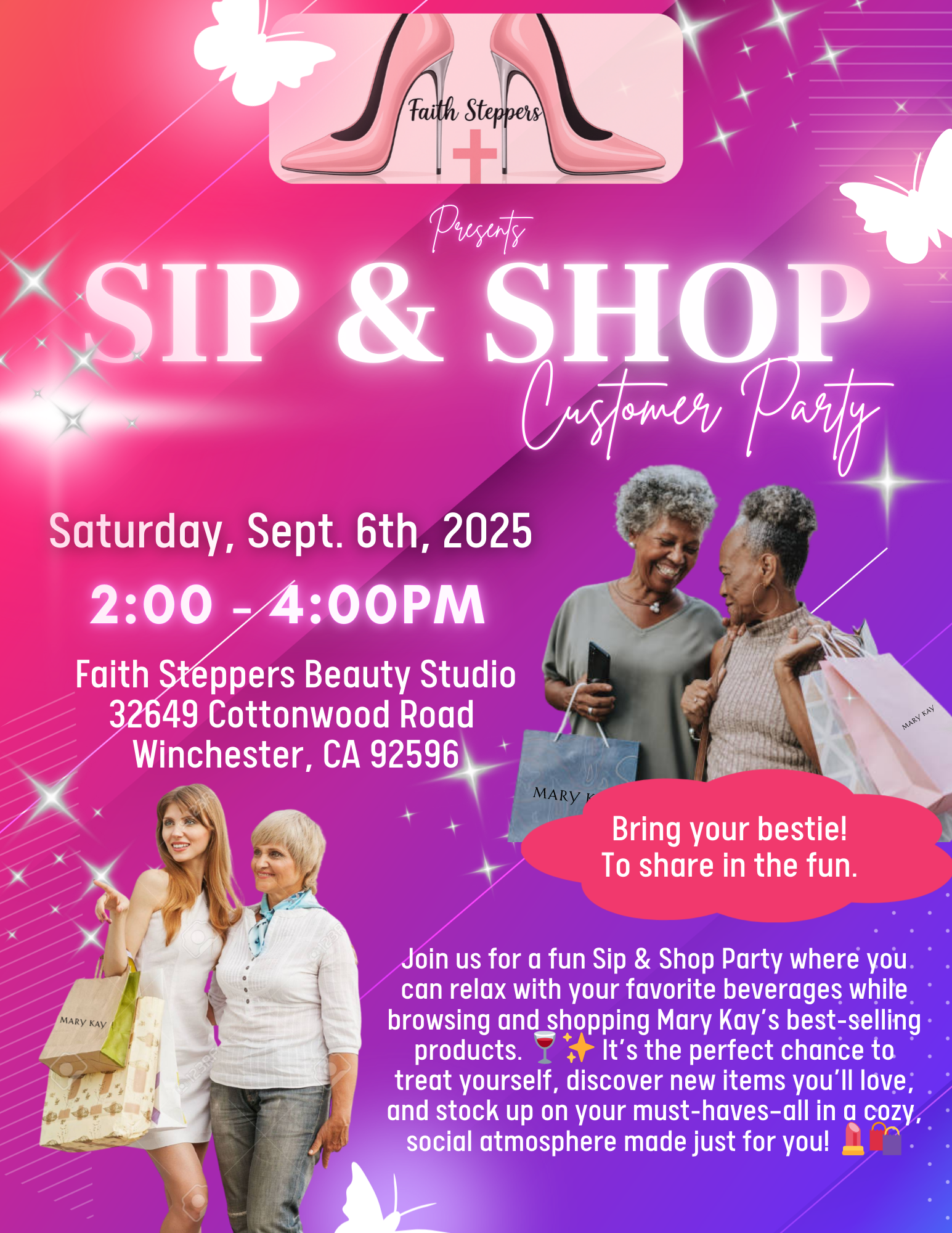 Join us for a fun Sip & Shop Party where you can relax with your favorite beverages while browsing and shopping Mary Kay’s best- selling products. It’s the perfect chance to treat yourself, discover new items you’ll love, and stock up on your must-haves- all in a cozy, social atmosphere made just for you!