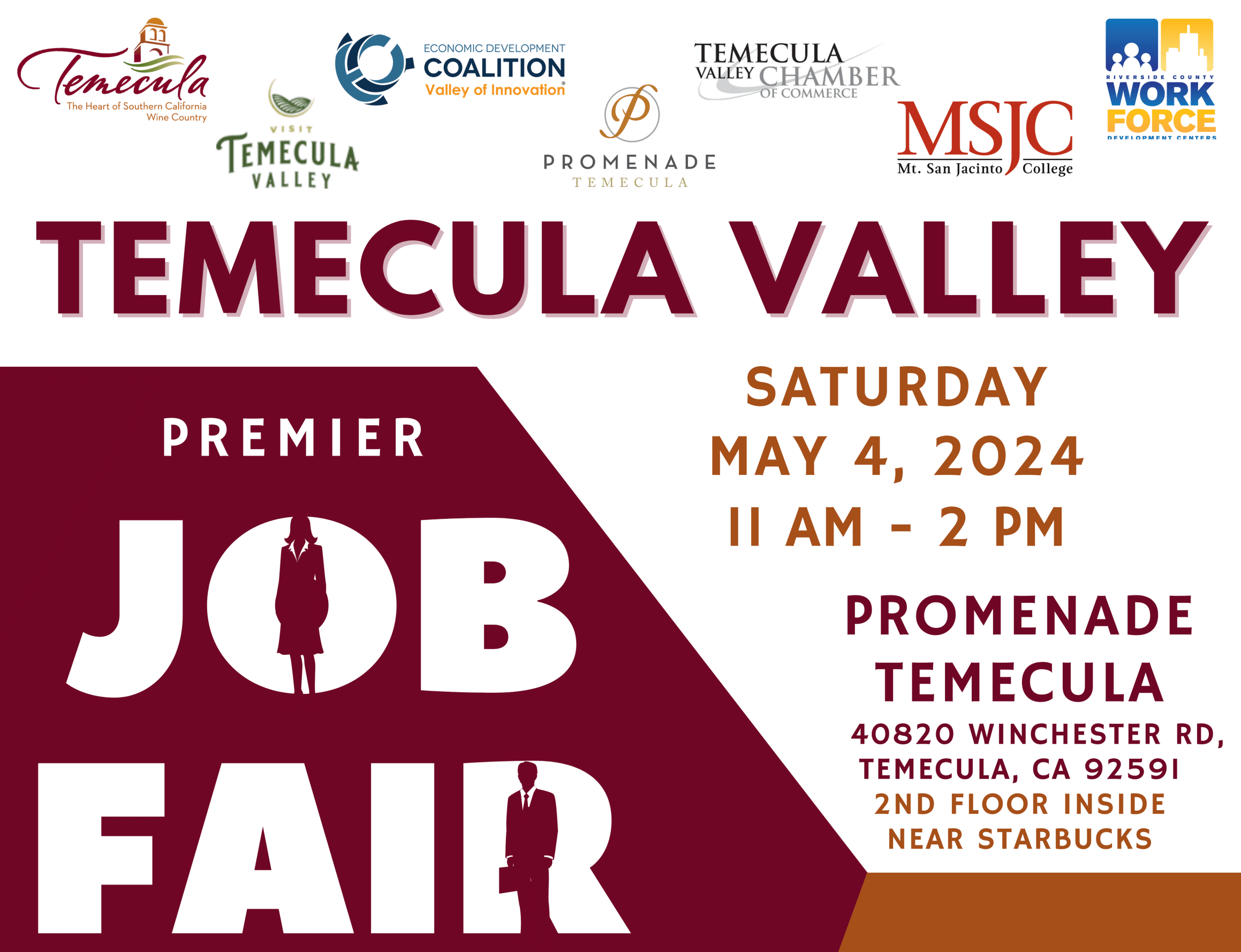 The Temecula Valley Premier Job Fair will provide great opportunities for both businesses seeking employees as well as any job seeker in the Temecula Valley. The Temecula Valley Chamber of Commerce is proud to co-host Temecula Valley's Premier Job Fair in partnership with the City of Temecula, Visit Temecula Valley, Economic Development Coalition, Promenade Temecula, Mt. San Jacinto College, and Riverside County Workforce Development Center. This event will take place on Saturday, May 4, 2024 from 11:00 AM – 2:00 PM at the Promenade Temecula Mall located at 40820 Winchester Road, Temecula, CA 92591. (Located inside the mall on the second floor near Starbucks.)