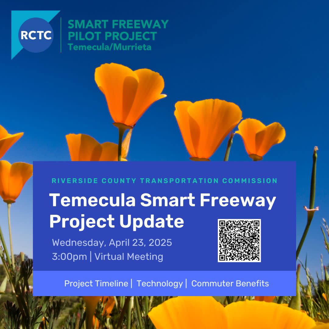 Join us for a virtual update on the Temecula Smart Freeway Project, hosted by the Riverside County Transportation Commission (RCTC) on Wednesday, April 23, 2025, at 3:00 PM.