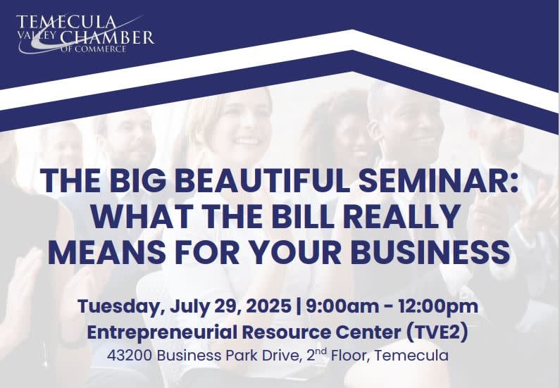 The Temecula Valley Chamber of Commerce invites local businesses to attend an informative and timely educational workshop focused on the newly enacted federal legislation, known as the “Big Beautiful Bill” (H.R.1). Spanning more than 900 pages, this comprehensive bill introduces far-reaching changes that will impact businesses across various sectors—from taxation and regulatory compliance to workforce and funding programs.
