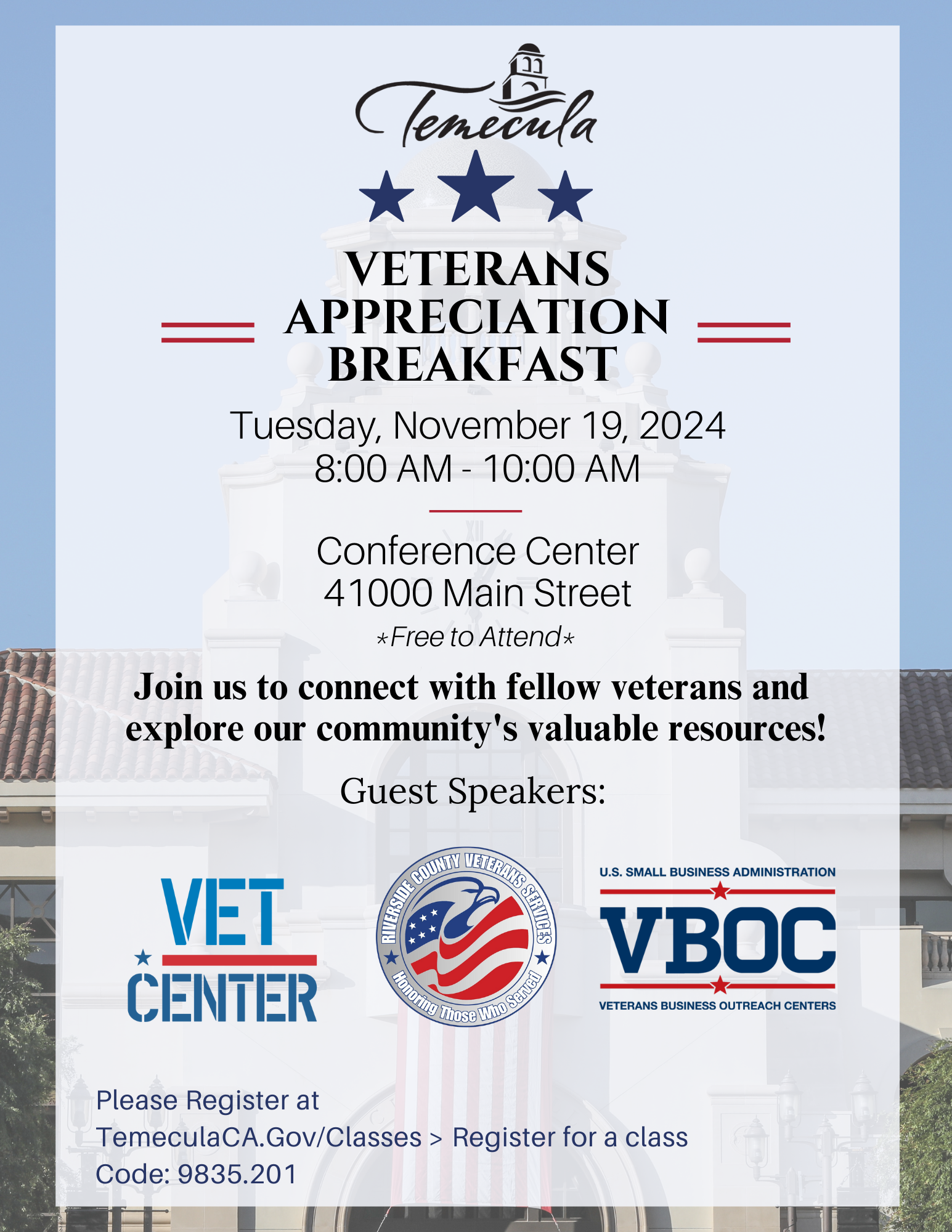 The City of Temecula is excited to announce the Veterans Appreciation Breakfast taking place on Tuesday, November 19, 2024, from 8:00 AM – 10:00 AM at the Temecula Conference Center located at 41000 Main Street, Temecula, CA 92590. This free event aims to bring the community together to honor and celebrate the brave individuals who have served our nation.