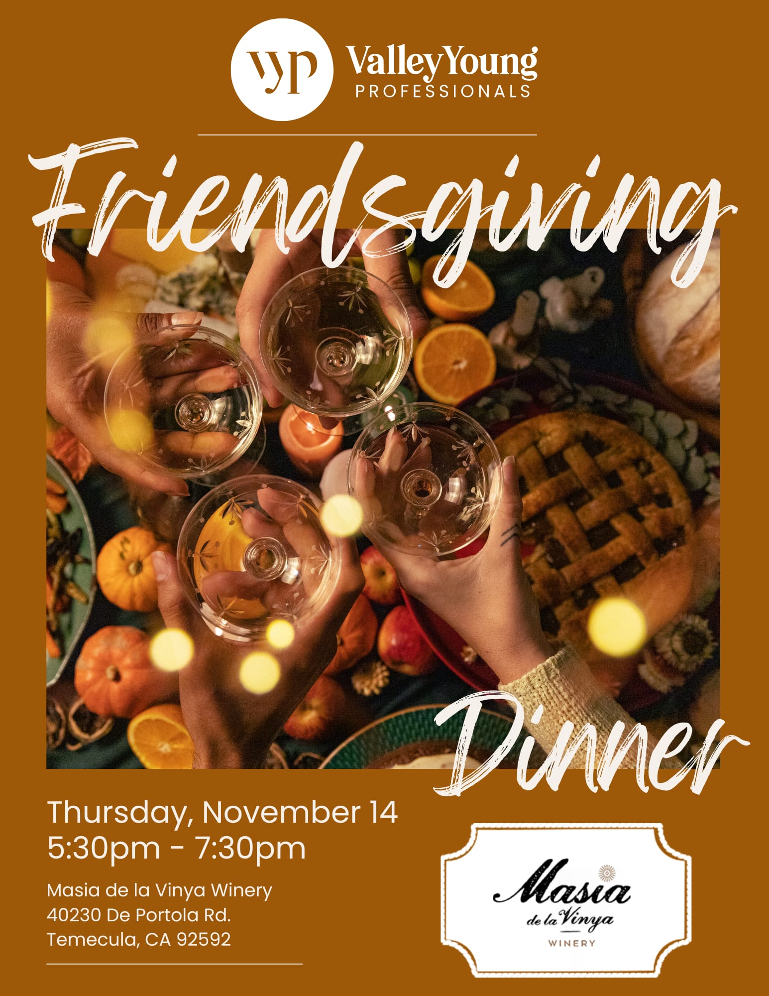 Join us for our Annual Valley Young Professionals Friendsgiving! Let's get together to share in the past years successes and look forward to an awesome VYP future. We are so excited to be hosted by Masia de la Vinya Winery!