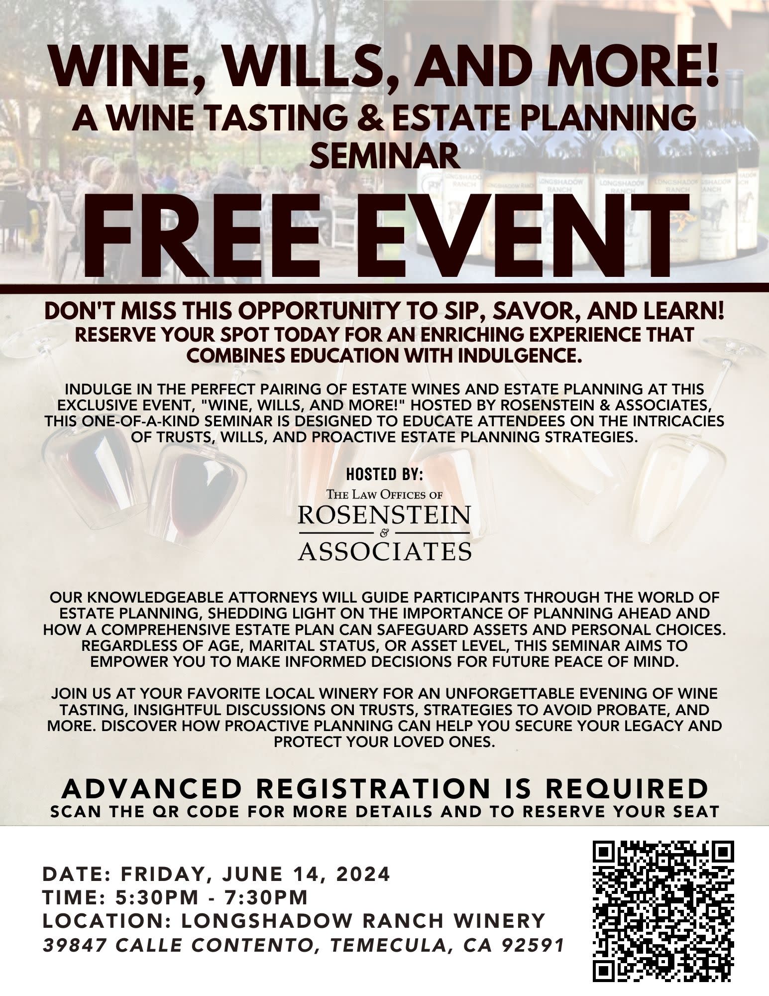 INDULGE IN THE PERFECT PAIRING OF ESTATE WINES AND ESTATE PLANNING AT THIS EXCLUSIVE EVENT, "WINE, WILLS, AND MORE!" HOSTED BY ROSENSTEIN & ASSOCIATES, THIS ONE-OF-A-KIND SEMINAR IS DESIGNED TO EDUCATE ATTENDEES ON THE INTRICACIES OF TRUSTS, WILLS, AND PROACTIVE ESTATE PLANNING STRATEGIES.